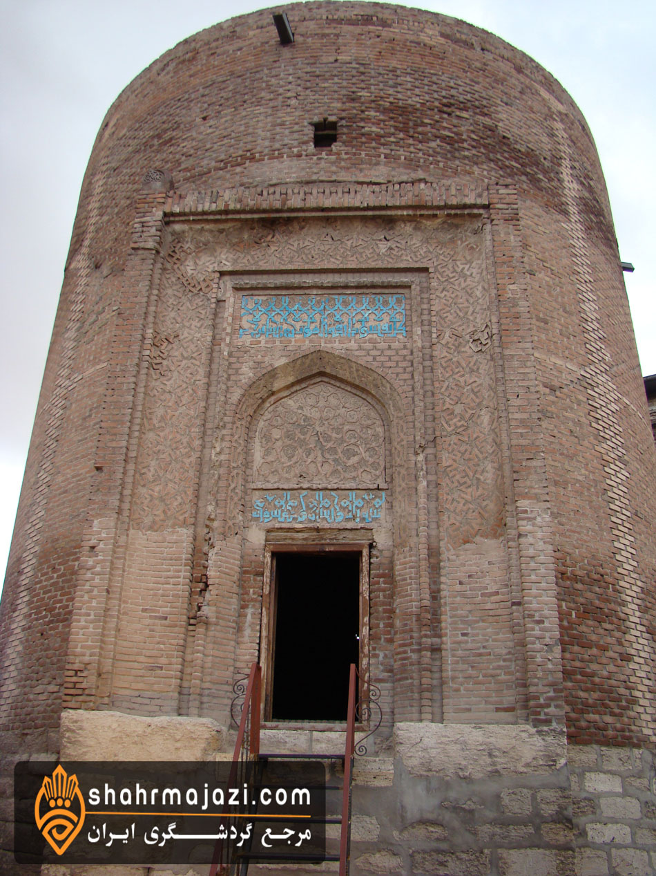 بالای ورودی برج مدور یک قاب و تاقی به شکل هلال داشته که اطراف درگاه را فرا گرفته بود و در بالا و زیر این تاق هلالی شکل، کتیبهای وجود داشت که به خط کوفی با نقش های پیچیدهای از کاشیهای فیروزهای رنگ، آجر چشم را به خود جلب میکرد.با بررسی هایی که بر روی باقی مانده های اين برج انجام شد. به این اشاره دارد كه برج های مزبور دارای پلان گرد شکل بوده و برای ساخت سنگ فرش و اطراف آن از مصالحی مثل: قطعه های سنگی نسبتا بزرگ مربوط به دوره سلجوقی، ساروج و.... استفاده شده.این برج با ظاهری ساده است و دارای دو طبقه است، سردابه و اتاق فوقانی. اگر هم قبلا قبری در قسمت سردابه بوده ، به مرور زمان اثری از آن نمانده و از بین رفته است. دیزاین كاشی و نقش ها که مابین این آجرها به شکل مهره هایی با طرح الله و نقش های هندسي شکل بكار رفته و.... تمامی این موارد امتياز و جلوه خیلی خاصی به اين برج داده اند. اتاق بالایی پوشش طرح هایی ازگچبری و دیزاین گچی داشته كه از آن طرح و نقش و نگار فقط در قسمت های کمی آن قطعات زیبا باقی مانده و بقیه آنها از بين رفته. نمای بیرونی این ساختمان خیلی ساده است و از ازاره سنگی و آجركاری معمولی ساخته شده است.
