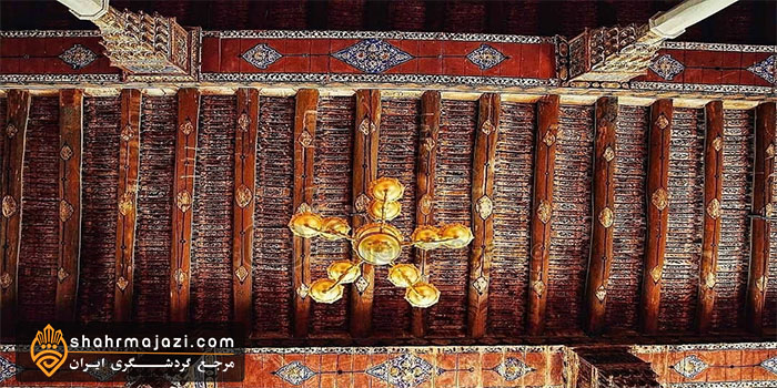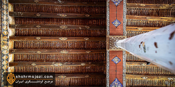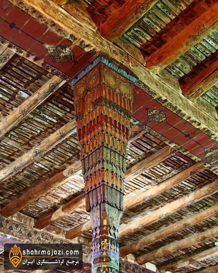 ستون های چوبی موجود در خوابگاه روی پایه های از جنس سنگ قرار دارند و با برجسته کاری خیلی زیبا و لمبه کاری جلوه زیبایی به خود گرفته است. سقف این مسجد با انواع نقش های نگار گل ها و گیاهان و نقش های اسلیمی و ظریف تزیین شده که زیبایی چشم نوازی دارد. ستون ها هم با رنگ هایی زیبا و زنگ هایی که چشم را نوازش میکنند و نقش های ظریف و خط اسلیمی با زیبایی تمام تزئین شده است. در خوابگاه یک کتیبه دیگر هم وجود دارد که نشان دهنده فردی است که در سال 1261 ه.ق بانی نوسازی و بازسازی این مسجد بوده. نقاشی های این قسمت کار شخصی به اسم (علی اصغر) که فرزند ابوالحسن بوده است. کتیبه دوم دقیقا روبروی محراب مسجد و روی یک ستون چوبی که در انجا قرار دارد است و البته اسم یک بانی دیگر هم که نامش (ملا داوود) و یک نقاش دیگر به اسم اسد نقاش تبریزی را به ما نشان میدهد. این مسجد از دسته زیبا زیباترین نمونه های مسجد های تاریخی دوران صفوی است که در آن هنر نقاشی در اوج است.